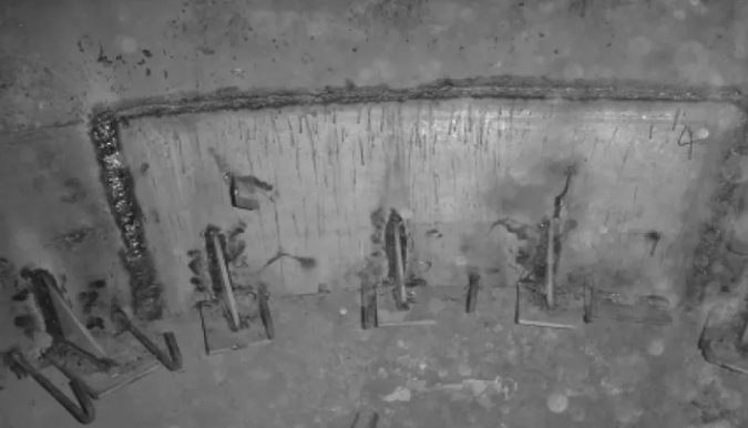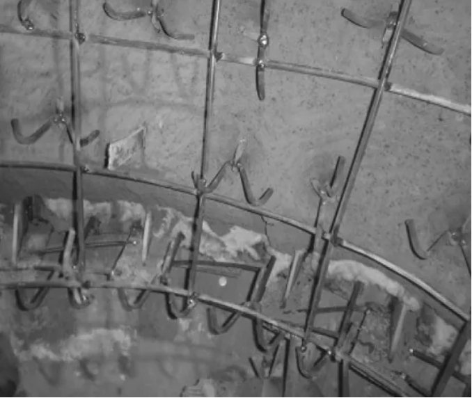 (4)原錨固件為Y銷釘,每隔150mm交錯布置,銷釘端部沒有鋼筋網(wǎng)格,使耐火材料無法形成整體,個別銷釘失效后會使局部耐火材料松動,相鄰耐火材料之間沒有可靠聯(lián)系,終脫落。